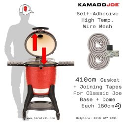 Replacement | Upgrade High Temp. resistant wire mesh reinforced gasket kit to fit all Kamado Joe Classic I, II & III models. Easy replacment of old worn out greasy gaskets, or upgrading from felt gasket. Kit is supplied as ONE Long 410cm length with enough for the lower base and top dome lid, simply cut to length. Kit is supplied with 2 x self-adhesive joining tapes, to complete your circle at the rear of the grill, by the hinge
