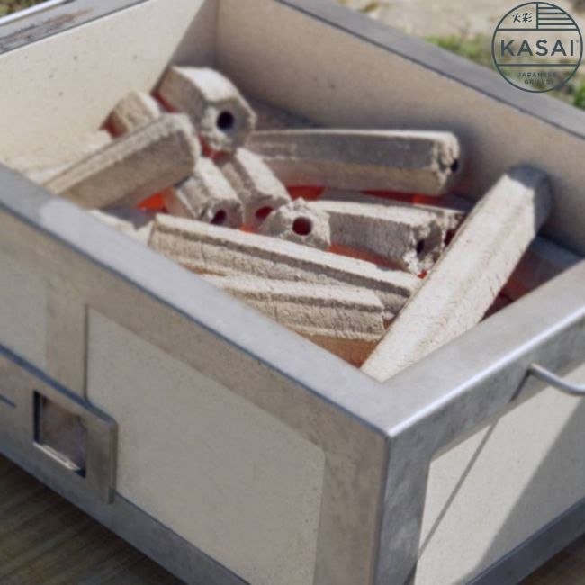The nature of the Kasai grill and the Japanese BBQ cooking style works best when the grill is extremely hot, we recommend using Sumi Bincho Charcoal due to its long burning properties and its ability to seal in natural flavours without imparting any other aromas