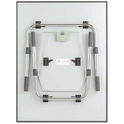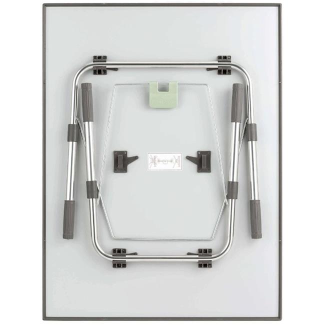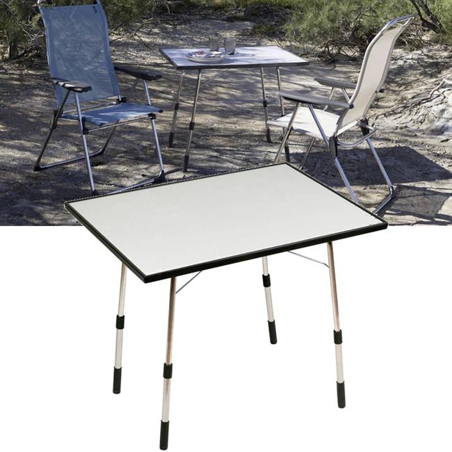 The four independently-adjustable, foldable telescopic legs, with safety clip. These will guarantee a horizontal tabletop, whatever the terrain. Elastomere foot glides to enhance stability. Thick aluminum alloy tubing legs, to offer sturdiness and rigidity. Also notable for its resistance to the elements. The monobloc tabletop, designed to resist heat (maximum temperature 140°), moisture (with the raised edge) and UV exposure. Compactness when folded makes carrying and storage easy.