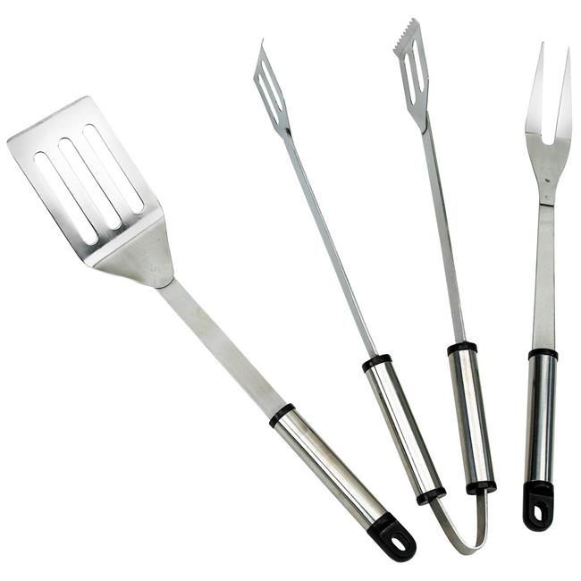 Stainless steel 3 piece tool set consisting of barbecue fork, turner and tongs.