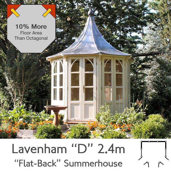 This unique "D" Shaped - "Flat Back" Summerhouse is an evolution of the Octagonal Lavenham, with a re-designed square rear half. Resulting in an elegant half octagonal / half square design with a Victorian feel. The design came about through customer feedback, where the need for larger "L" shape lounge furniture was required, this shape also benefits customers wishiong to use the garden room as an office or home gym. A "D" Shape has a 10% larger floor area that a regular Octagonal building. Attention to detail is all in the Lavenham "D" Summerhouse. From fluted posts to arched tracery, every aspect of its design creates a structure fit to command a place in the finest of gardens.