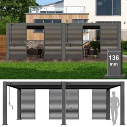NEW Heavy Duty Louvred Roof Pergola - with substantial 136mm square legs. And wide twin wall louvre blades which overlap eachther when closed to form a waterproof roofin system that can bes used for many purposes: Seating & dining, outdoor kitchen projects, creating full or partial shade with the turn of a handle.