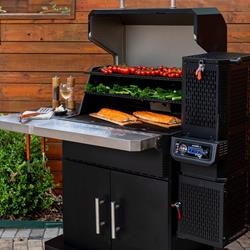 - Includes reversible smoke + sear cast iron grates for low and slow smoking and high heat searing