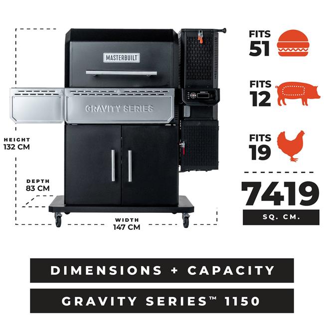 Experience convenient charcoal cooking in the comfort of your back garden with the Gravity Series 1150 Digital Charcoal Grill and Smoker by Masterbuilt. Engineered by experts to level up your charcoal grilling, this grill and smoker combo offers automatic temperature control and features revolutionary app technology that transforms your backyard cooking experience. Simply load your charcoal in the GravityFed hopper, set your cooking temperature on the digital control panel or by using the Masterbuilt app, and let the DigitalFan do the work to maintain temperatures from 105 - 370C (225 - 700F). With the ability to smoke, sear, roast and bake – explore endless cooking options all while maintaining the rich and unmatched flavor of charcoal, only from Masterbuilt.