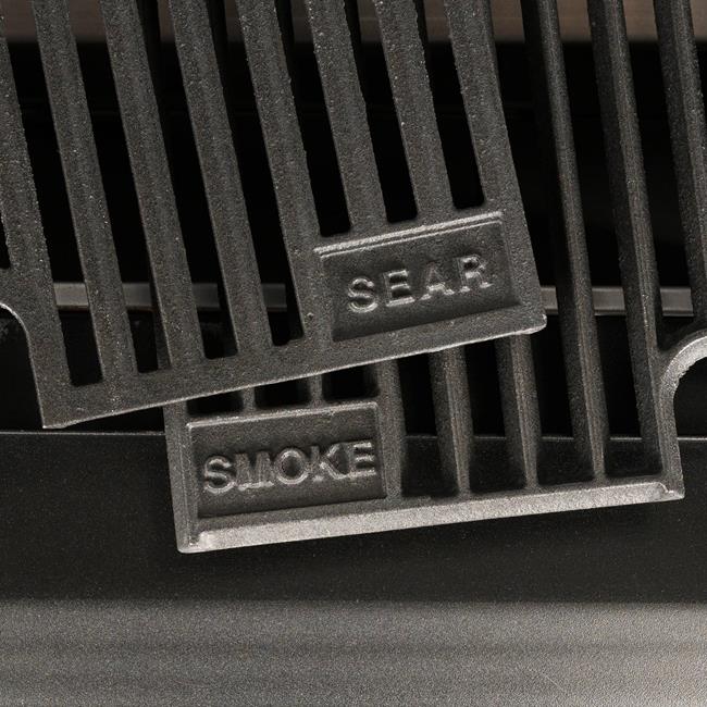 - Includes reversible smoke + sear cast iron grates for low and slow smoking and high heat searing