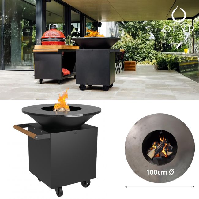 The OFYR Classic 100 PRO has all the characteristics of the OFYR Classic with the added convenience of a handle and wheels. You can easily move your cooking unit around. The handle is made from teak wood, so it is advisable to store the OFYR Classic 100 PRO inside or sheltered. Only available in 100 cm in diameter.