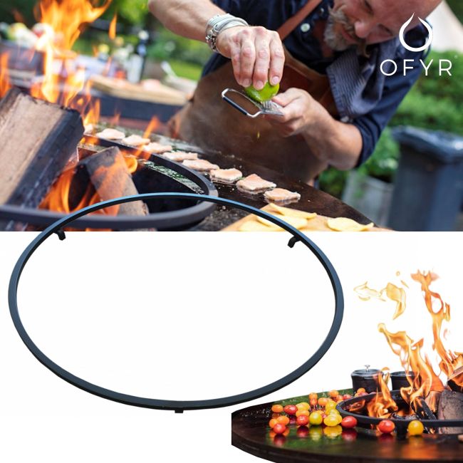 The cooking plates of the OFYR cooking units run slightly downward towards the center. When the cooking plates are heated, the center will drop a little further down. The result is that round food such as tomatoes, but also very fatty food, can roll or slide to the center of the cooking plate and fall into the fire. To avoid this, the OFYR Food Bumper has been developed. The raised steel rim stops the food but still offers the possibility to scrape the cooking plate clean with the spatula and push the scrap under the rim into the fire.