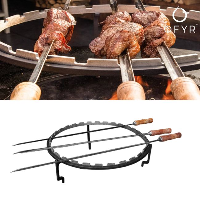 Barbecue fans will love this set of three steel skewers on a specially designed stand. Placed over an OFYR cooking unit’s fire, the heightened stand with notched ring is just the right height for meat and vegetables to cook to perfection.