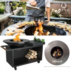 The OFYR Island 100 PRO is the mobile version of the OFYR Island 100 with a deeper base. It includes a solid chopping board for food preparation, a handy accessories tray and space for under-counter wood storage. The chopping board is available in teak wood and dark grey ceramic.