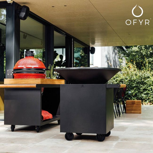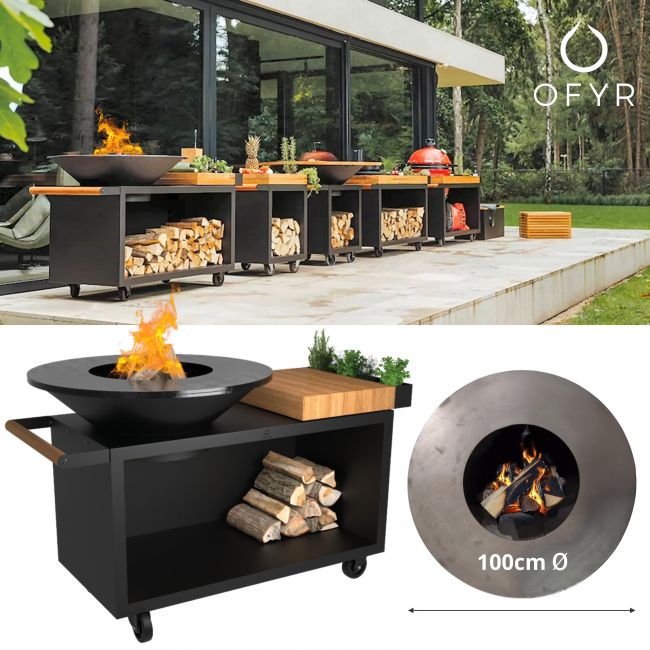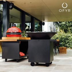 The OFYR Island 100 PRO is the mobile version of the OFYR Island 100 with a deeper base. It includes a solid chopping board for food preparation, a handy accessories tray and space for under-counter wood storage. The chopping board is available in teak wood and dark grey ceramic.
