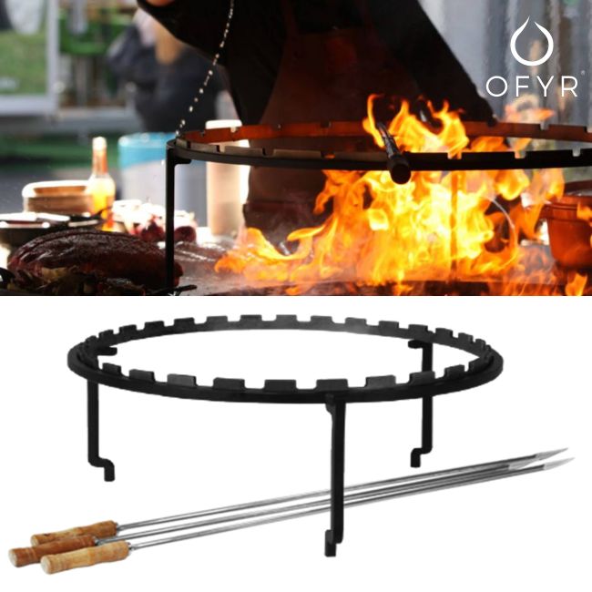 Barbecue fans will love this set of three steel skewers on a specially designed stand. Placed over an OFYR cooking unit’s fire, the heightened stand with notched ring is just the right height for meat and vegetables to cook to perfection.