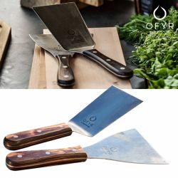 This OFYR Spatula Set consists of two essential utensils for outdoor cooking: a burger turner and a solid spatula. The Burger Turner has a long blade, with which you can easily flip your favourite patties or veggies on the cooking plate. The blade has a raised edge near the handle, ensuring maximum control and stability when flipping food. The spatula keeps fragile foods like fish and pancakes in one piece.