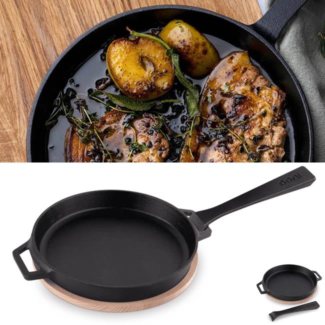 Our premium cast iron Ooni Skillet is perfect for cooking meat, seafood, vegetables and much more in your Ooni pizza oven. The Ooni Skillet comes with a custom-designed removable cast iron handle making it easy to get sizzling hot food straight from your oven to the table, and a sustainably sourced wooden board for serving.