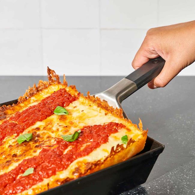 The Ooni Pan Pizza Spatula is the ultimate tool for removing and slicing deep dish and other pan-style pizzas before serving.