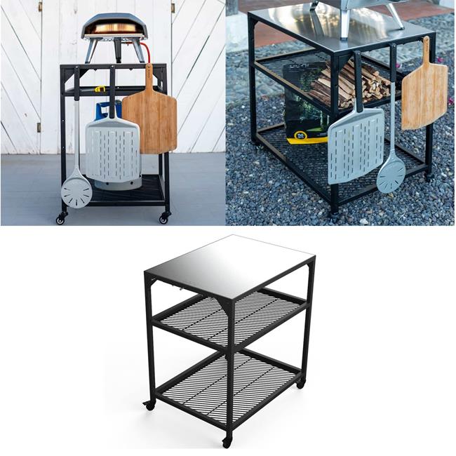 Ooni Modular Tables are the perfect surface for your Ooni pizza oven and accessories. All Ooni pizza oven models fit perfectly on the stainless steel work surface, and your propane tank will fit neatly on the lower shelf. Our tables are made of robust powder-coated carbon steel. They also feature two height-adjustable shelves and built-in hooks for your Ooni peels and accessories. Plus, the two lockable castors will keep your table steady while you cook.
