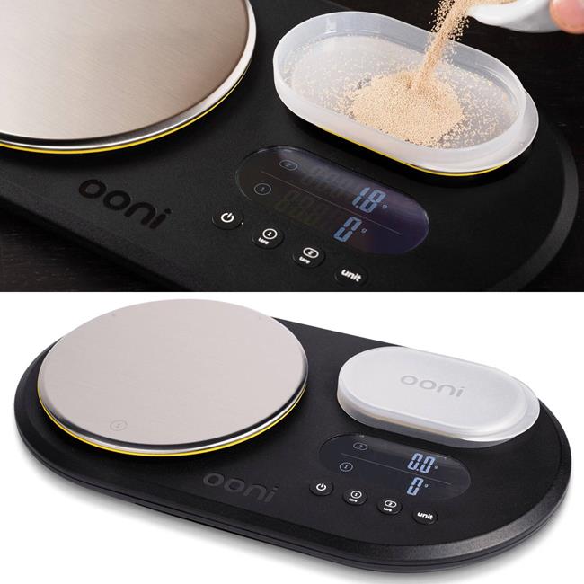 Streamline your pizza prep and make the perfect dough every time with the Ooni Dual Platform Digital Scales. Measure out all your ingredients to a tenth of a gram - yes, even those tiny amounts of salt and yeast - using the brushed stainless steel platforms, a dual LCD display to see both platform measurements simultaneously, and a custom-fit measuring dish for yeast or herbs.