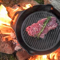 The patina, which becomes stronger with every use, prevents your food from sticking. This chemical-free non-stick effect occurs naturally and makes the grill fire pan even more robust and resistant over time. The stronger the patina, the less oil and fat you need when cooking. Food liquids collect in the grooves, leaving behind the typical roasted stripes and an incomparable aroma.