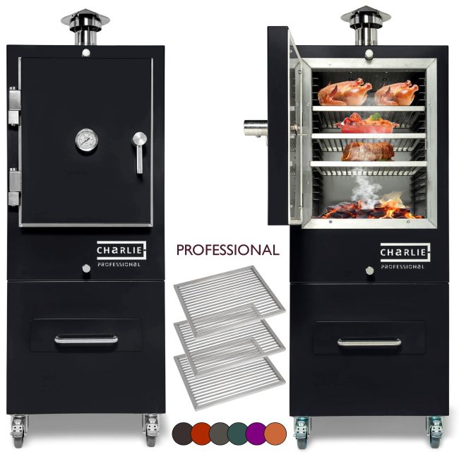 Charlie Professional Ovens are made of solid steel & weight 240KG are very easy to light & being so heavy & superbly insulated by design retain heat like nothing else, and can be set just like your oven at home to anywhere between 100-400 Degrees Centigrade and hold that temperature for hours - unattended. The Professional's advanced insulation makes it so efficient consumption is just 4-6kg of charcoal for the WHOLE DAY ! Charcoal or wood fired this is not a Barbecue ! Yes you can grill over an open flame if you wish, but the Charlie Oven cooks primarily from the heat retained & radiated from the thermal mass of the heavy steel construction, gently caressing your food from every angle - just like an AGA or heavy Range Cooker which is why people who love to cook, love Charlie Ovens. With the door closed, heat, moisture and all those lovely charcoal aromas are sealed in the oven, producing outstanding results from very little fuel.