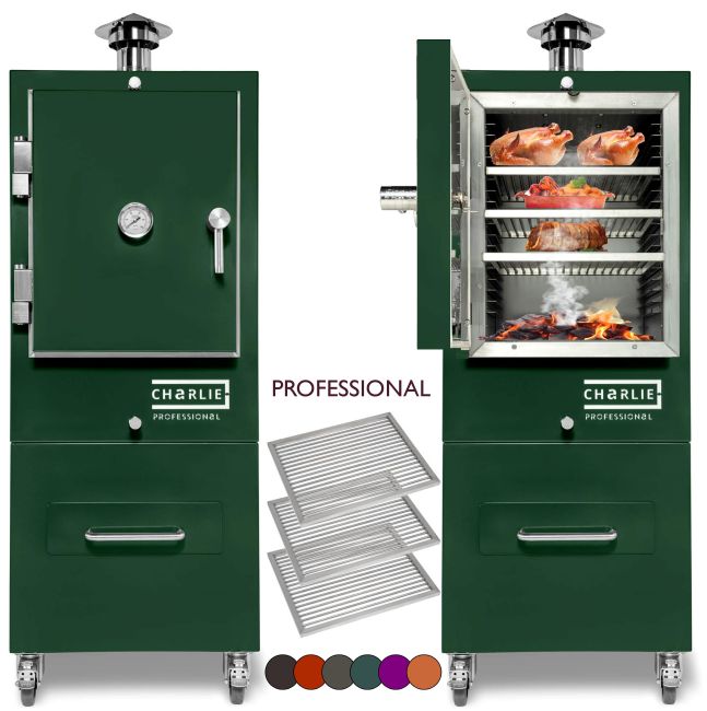 Charlie Professional Ovens are made of solid steel & weight 240KG are very easy to light & being so heavy & superbly insulated by design retain heat like nothing else, and can be set just like your oven at home to anywhere between 100-400 Degrees Centigrade and hold that temperature for hours - unattended. The Professional's advanced insulation makes it so efficient consumption is just 4-6kg of charcoal for the WHOLE DAY ! Charcoal or wood fired this is not a Barbecue ! Yes you can grill over an open flame if you wish, but the Charlie Oven cooks primarily from the heat retained & radiated from the thermal mass of the heavy steel construction, gently caressing your food from every angle - just like an AGA or heavy Range Cooker which is why people who love to cook, love Charlie Ovens. With the door closed, heat, moisture and all those lovely charcoal aromas are sealed in the oven, producing outstanding results from very little fuel.