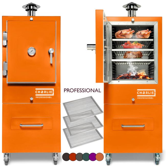 Charlie Professional Ovens are made of solid steel & weight 240KG are very easy to light & being so heavy & superbly insulated by design retain heat like nothing else, and can be set just like your oven at home to anywhere between 100-400 Degrees Centigrade and hold that temperature for hours - unattended. The Professional's advanced insulation makes it so efficient consumption is just 4-6kg of charcoal for the WHOLE DAY ! Charcoal or wood fired this is not a Barbecue ! Yes you can grill over an open flame if you wish, but the Charlie Oven cooks primarily from the heat retained & radiated from the thermal mass of the heavy steel construction, gently caressing your food from every angle - just like an AGA or heavy Range Cooker which is why people who love to cook, love Charlie Ovens. With the door closed, heat, moisture and all those lovely charcoal aromas are sealed in the oven, producing outstanding results from very little fuel.