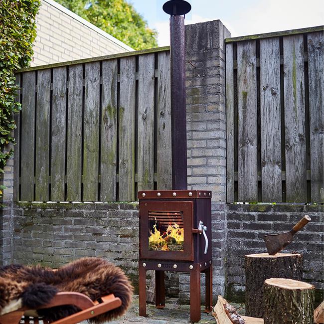 The PIQUIA is a compact CorTen steel wood stove with an industrial look. This terrace stove has a galvanized steel door handle and stainless steel lock bolts around, both above and below the door. These contrast well with the warm rustic plate material. There is also a small ash tray you can access from the back.