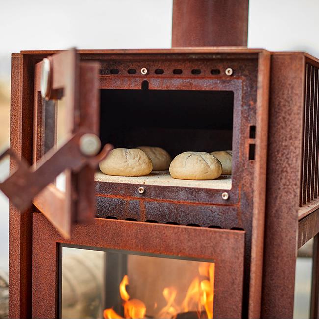 The oven has a pizza stone to prepare delicious pizzas or all kinds of bread, but also other oven dishes. The top plate gets very hot, so you can also use it to heat up certain things. The legs of the Quercus are fitted with stainless steel bolts so that you can place the fireplace free of the ground. Rust prints are therefore a thing of the past.
