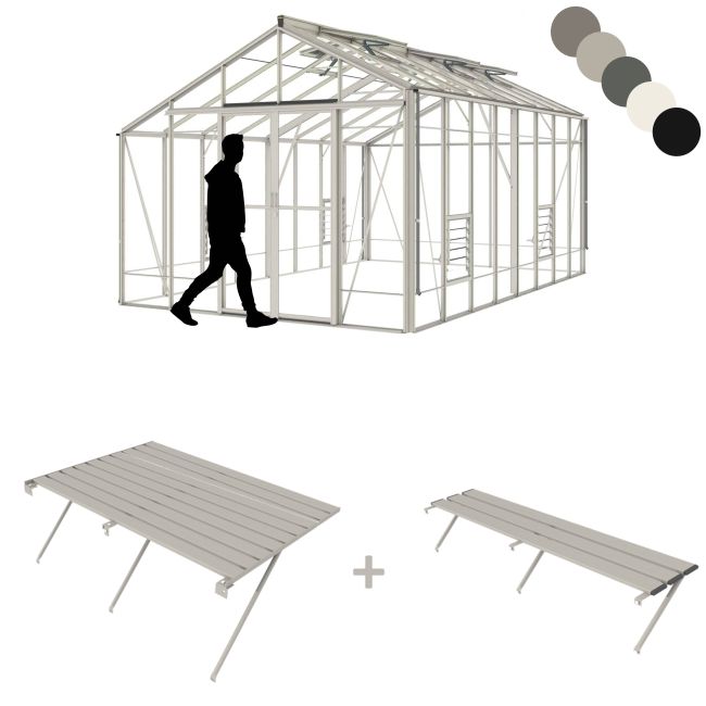 These superb greenhouses have been designed for the enthusiastic grower. Robinsons Redoubtable greenhouses are 10ft 6in (3208mm) wide and available in various lengths. They are outstandingly strong and well constructed. The width provides ample growing space. Off set double doors allow for up to 35in wide greenhouse staging to be positioned on one side and 25in wide greenhouse staging on the other. The Redoubtable features a unique 3/4 span design with an eaves height of 5ft 6in (1691mm) on one side and 6ft 6in on the other. A ground level door threshold allows freedom of movement for garden machinery, wheelbarrows and wheelchairs.