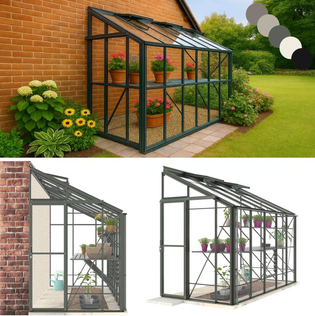 Robinsons spacious Lean-to can be fixed to most walls, although a southerly aspect is preferable. No extra base plinth is required, so there is no unsightly threshold strip. This multi purpose building can be used as a greenhouse or a sun lounge. Toughened safety glass is supplied as standard. The glass is retained with exterior grade UPVC and stainless steel screws.