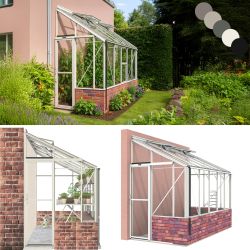 Robinsons spacious Lean-to can be fixed to most walls, although a southerly aspect is preferable. No extra base plinth is required, so there is no unsightly threshold strip. This multi purpose building can be used as a greenhouse or a sun lounge. Toughened safety glass is supplied as standard. The glass is retained with exterior grade UPVC and stainless steel screws.