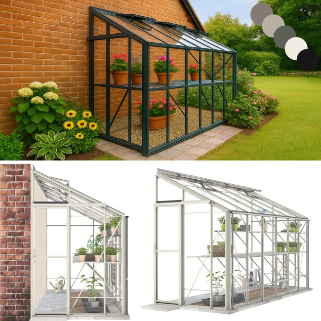 Robinsons spacious Lean-to can be fixed to most walls, although a southerly aspect is preferable. No extra base plinth is required, so there is no unsightly threshold strip. This multi purpose building can be used as a greenhouse or a sun lounge. Toughened safety glass is supplied as standard. The glass is retained with exterior grade UPVC and stainless steel screws.