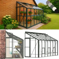 Robinsons spacious Lean-to can be fixed to most walls, although a southerly aspect is preferable. No extra base plinth is required, so there is no unsightly threshold strip. This multi purpose building can be used as a greenhouse or a sun lounge. Toughened safety glass is supplied as standard. The glass is retained with exterior grade UPVC and stainless steel screws.