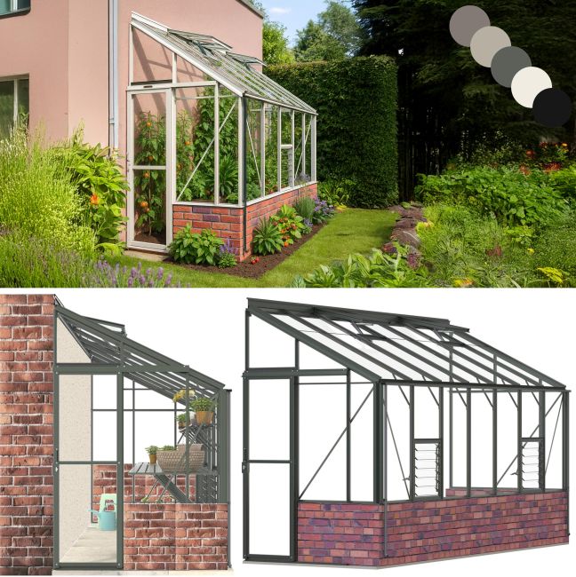 Robinsons spacious Lean-to can be fixed to most walls, although a southerly aspect is preferable. No extra base plinth is required, so there is no unsightly threshold strip. This multi purpose building can be used as a greenhouse or a sun lounge. Toughened safety glass is supplied as standard. The glass is retained with exterior grade UPVC and stainless steel screws.