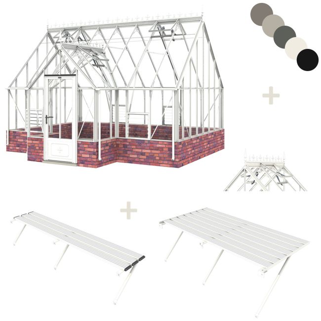 The Ramsbury ULTIMATE PACKAGE includes full width colour matched staging and shelving across the rear + Victorian ridge cresting and finials in the package price