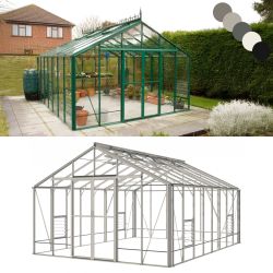 The Regal Professional is 12' wide, with lengths from 8' upwards in 2' increments. There is no limit to the length. Like the rest of the range, it is available in green or mill finishes and comes with 4mm toughened glass as standard. The major technical difference between the Regal and it's smaller sisters is the degree of stiffening of the frame. Ridge and eaves brackets as used on the smaller models are applied to every set of glazing bars - every 2 ft (610mm) - and extra structural stiffness is added to the door gable.