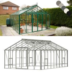 The Regal Professional is 12' wide, with lengths from 8' upwards in 2' increments. There is no limit to the length. Like the rest of the range, it is available in green or mill finishes and comes with 4mm toughened glass as standard. The major technical difference between the Regal and it's smaller sisters is the degree of stiffening of the frame. Ridge and eaves brackets as used on the smaller models are applied to every set of glazing bars - every 2 ft (610mm) - and extra structural stiffness is added to the door gable.
