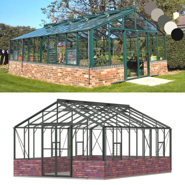 The Regal Professional is 12' wide, with lengths from 8' upwards in 2' increments. There is no limit to the length. Like the rest of the range, it is available in green or mill finishes and comes with 4mm toughened glass as standard. The major technical difference between the Regal and it's smaller sisters is the degree of stiffening of the frame. Ridge and eaves brackets as used on the smaller models are applied to every set of glazing bars - every 2 ft (610mm) - and extra structural stiffness is added to the door gable.