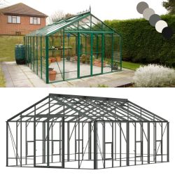 The Regal Professional is 12' wide, with lengths from 8' upwards in 2' increments. There is no limit to the length. Like the rest of the range, it is available in green or mill finishes and comes with 4mm toughened glass as standard. The major technical difference between the Regal and it's smaller sisters is the degree of stiffening of the frame. Ridge and eaves brackets as used on the smaller models are applied to every set of glazing bars - every 2 ft (610mm) - and extra structural stiffness is added to the door gable.