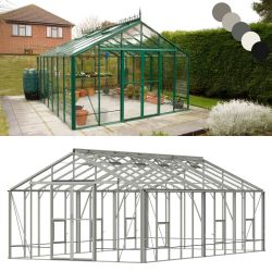 The Regal Professional is 12' wide, with lengths from 8' upwards in 2' increments. There is no limit to the length. Like the rest of the range, it is available in green or mill finishes and comes with 4mm toughened glass as standard. The major technical difference between the Regal and it's smaller sisters is the degree of stiffening of the frame. Ridge and eaves brackets as used on the smaller models are applied to every set of glazing bars - every 2 ft (610mm) - and extra structural stiffness is added to the door gable.