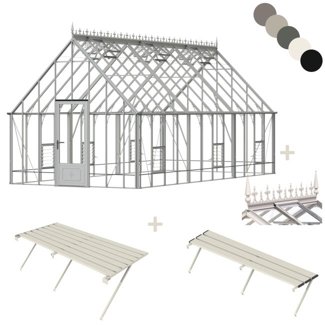 The Reigate ULTIMATE PACKAGE includes full length colour matched staging and shelving down one side + Victorian ridge cresting and finials in the package price