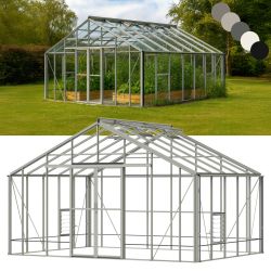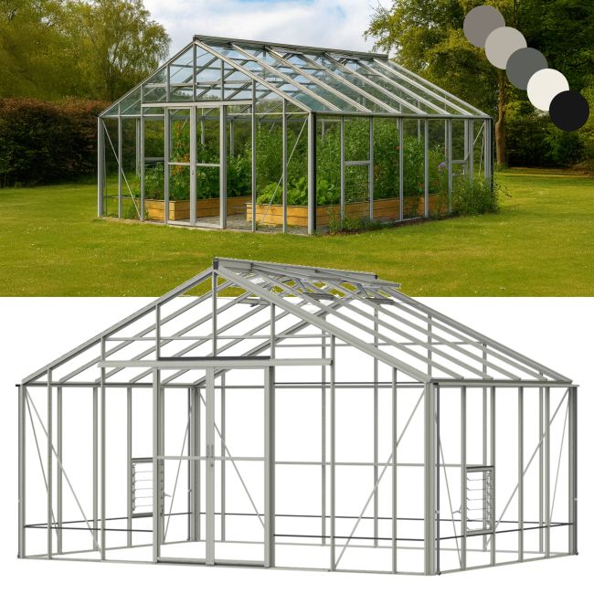 The Renown Professional is 14' wide, with lengths from 8' upwards in 2' increments. There is no limit to the length. Like the rest of the range, it is available in green or mill finishes and comes with toughened glass as standard.