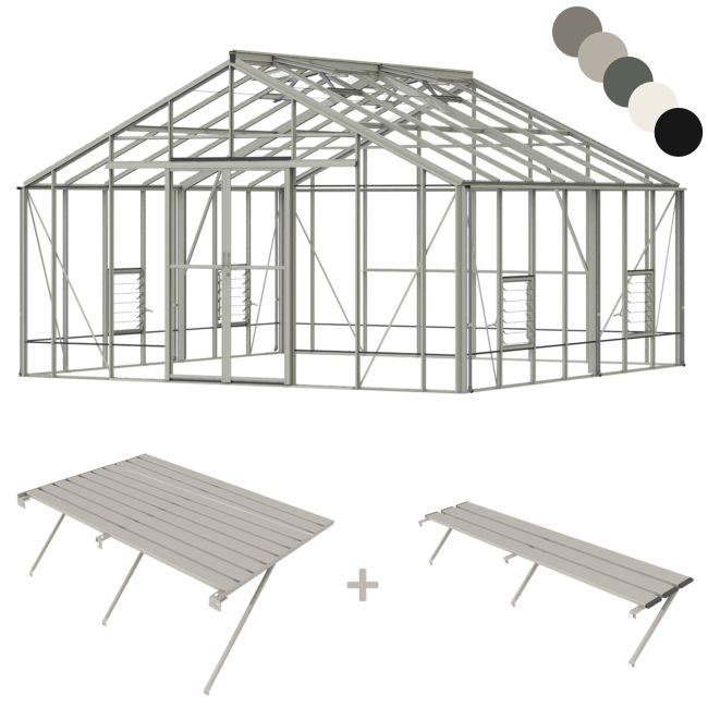The Renown Professional is 14' wide, with lengths from 8' upwards in 2' increments. There is no limit to the length. Like the rest of the range, it is available in green or mill finishes and comes with toughened glass as standard.