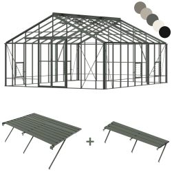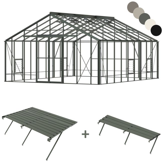 The Renown Professional is 14' wide, with lengths from 8' upwards in 2' increments. There is no limit to the length. Like the rest of the range, it is available in green or mill finishes and comes with toughened glass as standard.