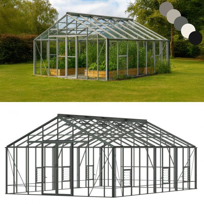 The Renown Professional is 14' wide, with lengths from 8' upwards in 2' increments. There is no limit to the length. Like the rest of the range, it is available in green or mill finishes and comes with toughened glass as standard.