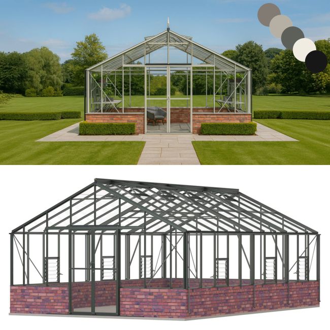 The Renown Professional is 14' wide, with lengths from 8' upwards in 2' increments. There is no limit to the length. Like the rest of the range, it is available in green or mill finishes and comes with toughened glass as standard.