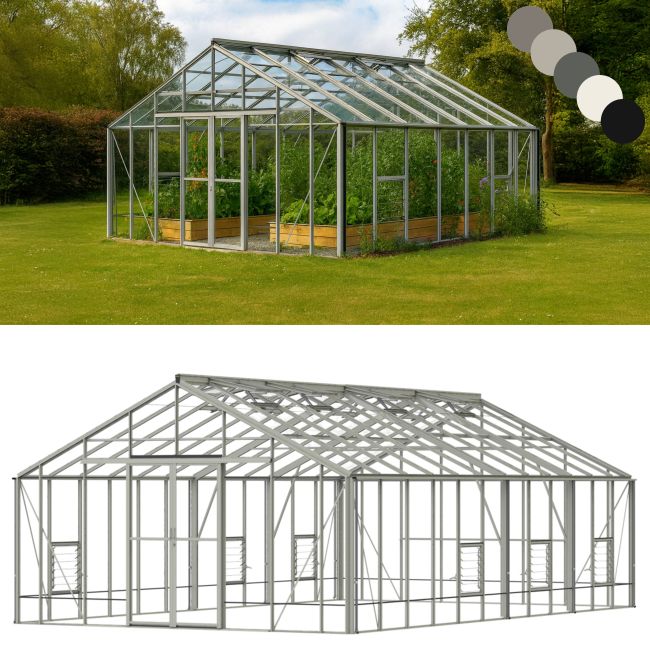 The Renown Professional is 14' wide, with lengths from 8' upwards in 2' increments. There is no limit to the length. Like the rest of the range, it is available in green or mill finishes and comes with toughened glass as standard.