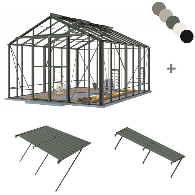 This ULTIMATE PACKAGE Includes 1 No. full length of 35" wide staging & 1 No. full length of 11" wide shelf - both the length of your greenhouse, powder coated & colour matched - you can decide which side to place them during assembly