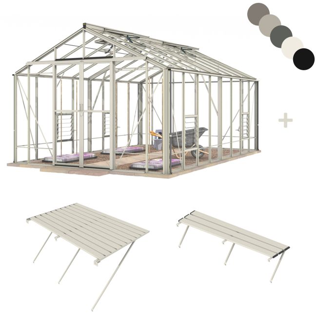This ULTIMATE PACKAGE Includes 1 No. full length of 35" wide staging & 1 No. full length of 11" wide shelf - both the length of your greenhouse, powder coated & colour matched - you can decide which side to place them during assembly