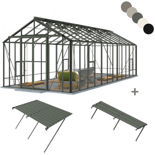 This ULTIMATE PACKAGE Includes 1 No. full length of 35" wide staging & 1 No. full length of 11" wide shelf - both the length of your greenhouse, powder coated & colour matched - you can decide which side to place them during assembly