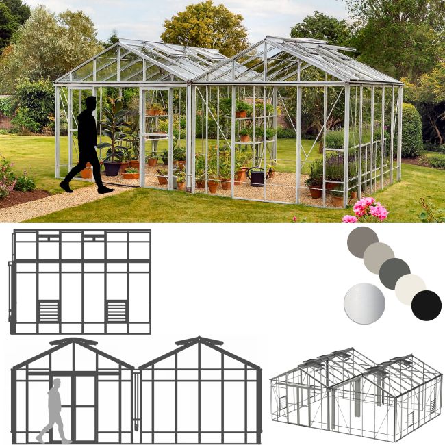 These superb greenhouses have been designed for the enthusiastic grower. Robinsons Rosette Reach Double Span greenhouses are a massive 21ft 9in (6628mm) wide and available in various lengths. They are outstandingly strong and well constructed. The width provides ample growing space. Double doors allow for up to 35in wide greenhouse staging to be positioned both sides. The Rosette Reach features a higher 6ft 6in (1985mm) eaves height and a ground level door threshold allows freedom of movement for garden machinery and wheelbarrows and wheelchairs.