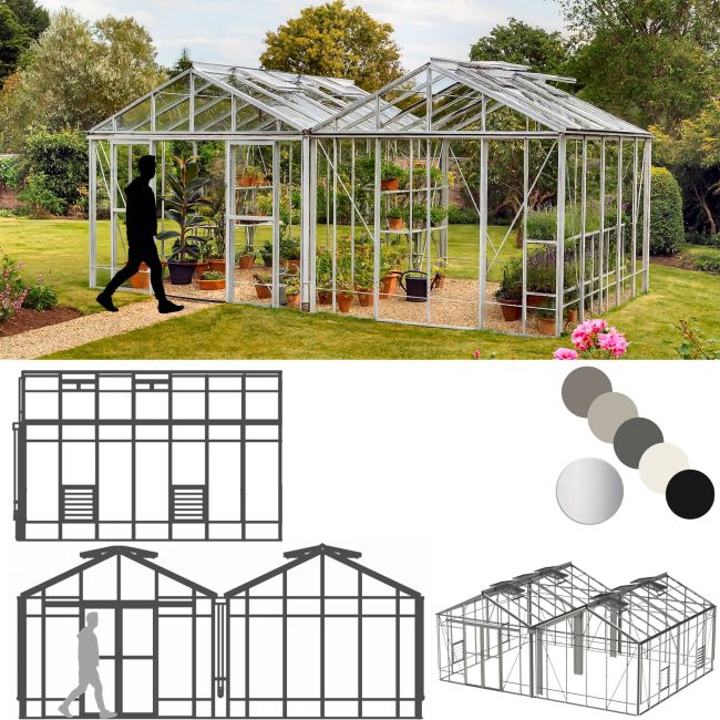 These superb greenhouses have been designed for the enthusiastic grower. Robinsons Rosette Reach Double Span greenhouses are a massive 21ft 9in (6628mm) wide and available in various lengths. They are outstandingly strong and well constructed. The width provides ample growing space. Double doors allow for up to 35in wide greenhouse staging to be positioned both sides. The Rosette Reach features a higher 6ft 6in (1985mm) eaves height and a ground level door threshold allows freedom of movement for garden machinery and wheelbarrows and wheelchairs.
